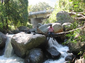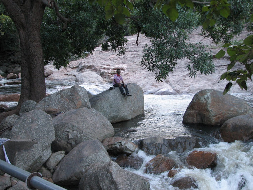 Then we walked couple of KMs more to reach the monkey falls, wondering how many monkeys would really be there and how much of trouble they would cause to us. Just in couple of minutes we reached there and understood what really those monkeys can do. It was jumping over the cars and bikes, dancing over the helmet that was locked to the bike, few small monkeys went under the cars and were playing like anything. And we assumed that the monkeys don’t do any harm to the tourists and entered in to the falls. We decided during the start of the trip itself that we wouldn’t take bath in the falls and stay away from the waters. So we decided to do things that wouldn’t get us wet. But somehow we managed to get wet…No no not by taking bath in the falls, we fell down with full style. We were clicking some snaps, while I was posing, Rukku was handling the camera. He asked me to go to the center of the falls so that he can take a better snap. I thought I was carefully keeping by feet, but just when I was about to position myself for the snap I felt something hit my head hard. Yeah I realized I fell down after hitting the hard rock. For few seconds I couldn’t even help myself getting up… There were couple of college students standing near by who gave their hands and saved me from sliding down. After standing up and coming back to normal state I was looking for this Rukku whom I thought would’ve started to come and see how I am doing. But I could see him standing at the same place and asking me to pose. I was like what the hell man? And went down to ask him if it was funny. But after I went down only I came to know that he had also fell down at the same instant when I fell down. In fact he had fell of a small cliff like thing and luckily he had his bag on the back which had saved his head hitting the ground and he was holding the camera up to save it too!! Thank god noting happened to the camera:) And then one guy came and told him, “enna sir photova indha angle laendha edukkaradhu…paarthu sir…” Ada paavingala naanga enna P.C.Sreeram-a, K.V.Anandh-a…edho memory stick ellam cheap-a irukkudhae nnu photo click panrom da…idhuvae film roll naa motha trip kkae naanga 40 photo dhaan da eduppom…If you closely observe the photo you can see the wet T-shirt…:)