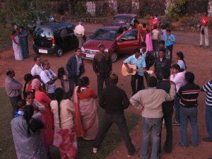 We were chatting with the driver throughout the journey and asked him to get us down say about 3 KMs before Vaalparai. He got us down and the remaining 3KMs we walked in the tea estates. That was the best part of the day as we went through the tea estates with a cold breeze and you could just walk like that any distance. Just before we entered Vaalparai, the driver who dropped us down was waving his hands as he took the next trip, of course in a different bus this time. After reaching Vaalaparai, we got tried to get the phone number of Rukku’s friend so that we could ask him the direction and all. But we weren’t able to get it. But we decided to go ahead with the information we had and took a taxi to reach that place. We reached the correct place as we could see Rukku’s friend there… 🙂 It was a Christian wedding and they had formed a group and were singing songs in praise of the lord.